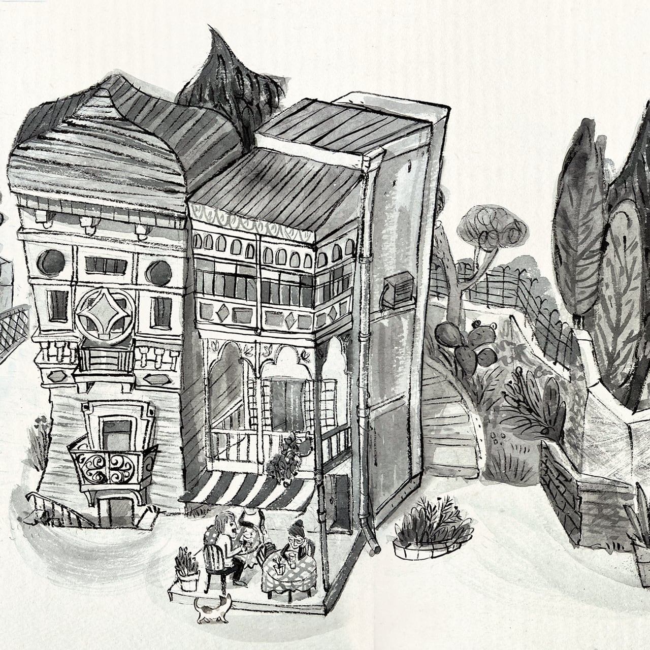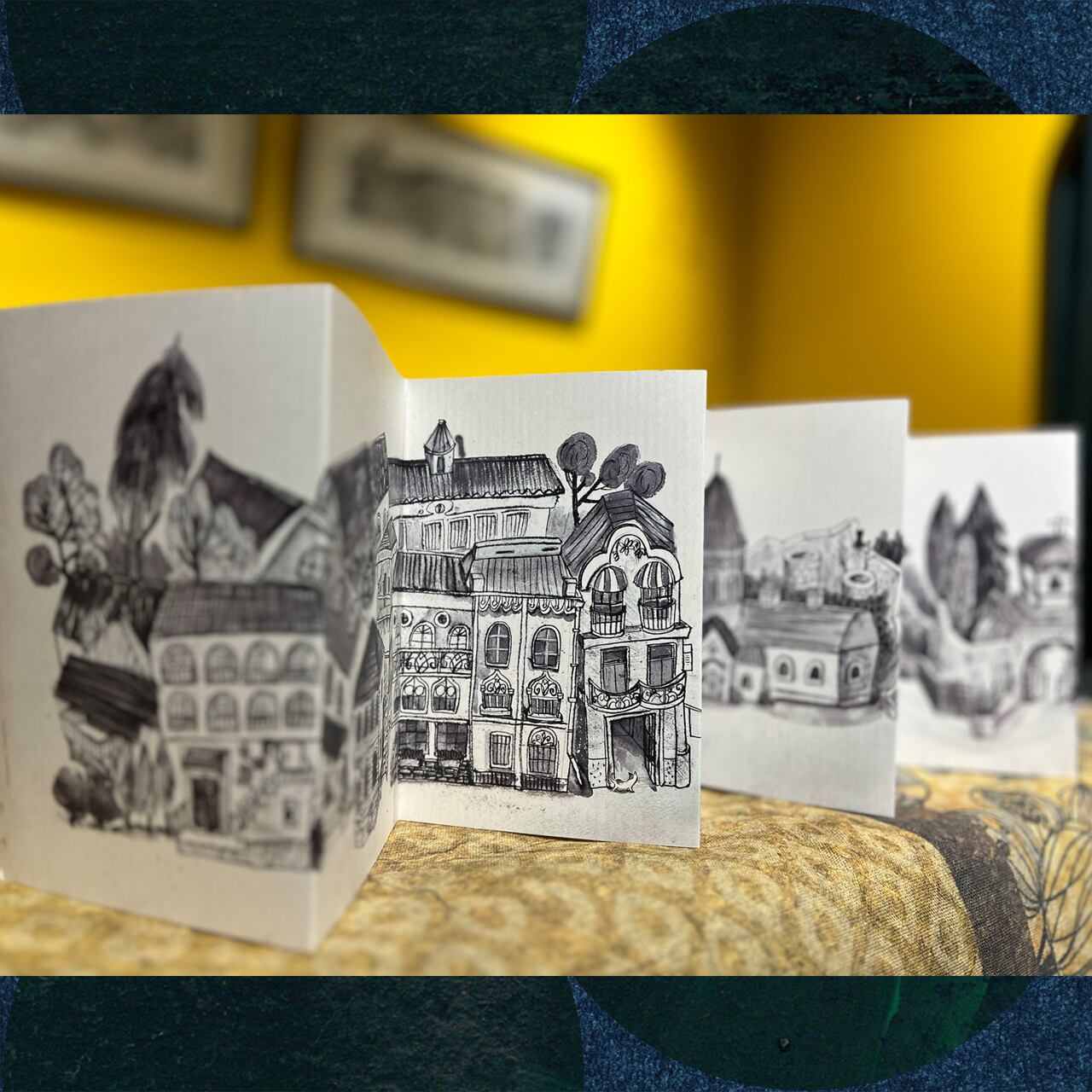 『トビリシ散歩』の2枚の絵を 蛇腹型のカードにアレンジしました。 蛇腹の折り方は自由に,楽しんでみてね♫ カードの高さに目線を落とすとカードの中の街並みに入り込んでしまったような錯覚に。 カードには、原画にはいない,猫たちがあちらこちらに…探してみてね♫ カードの裏は『トビリシの地図』