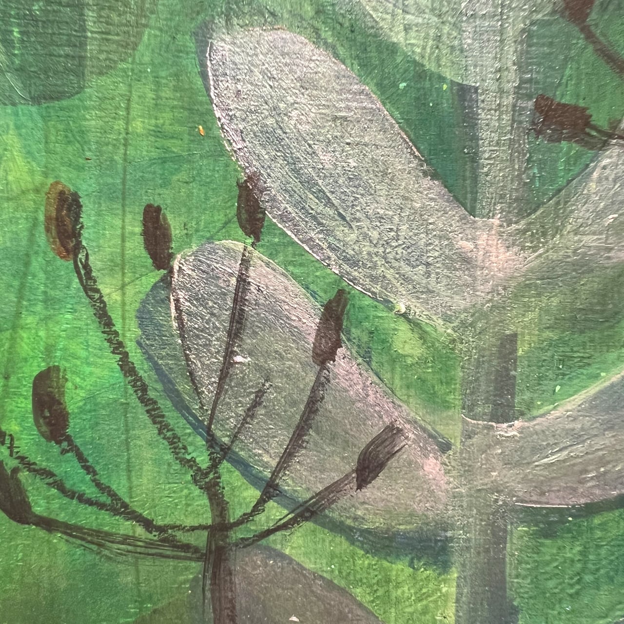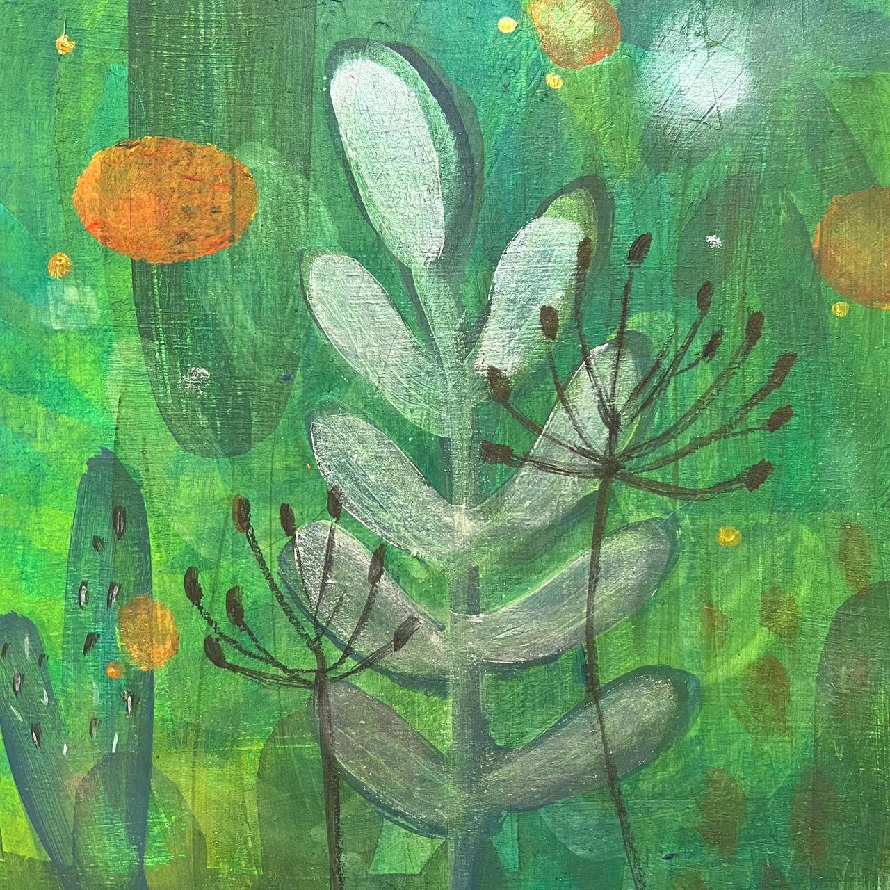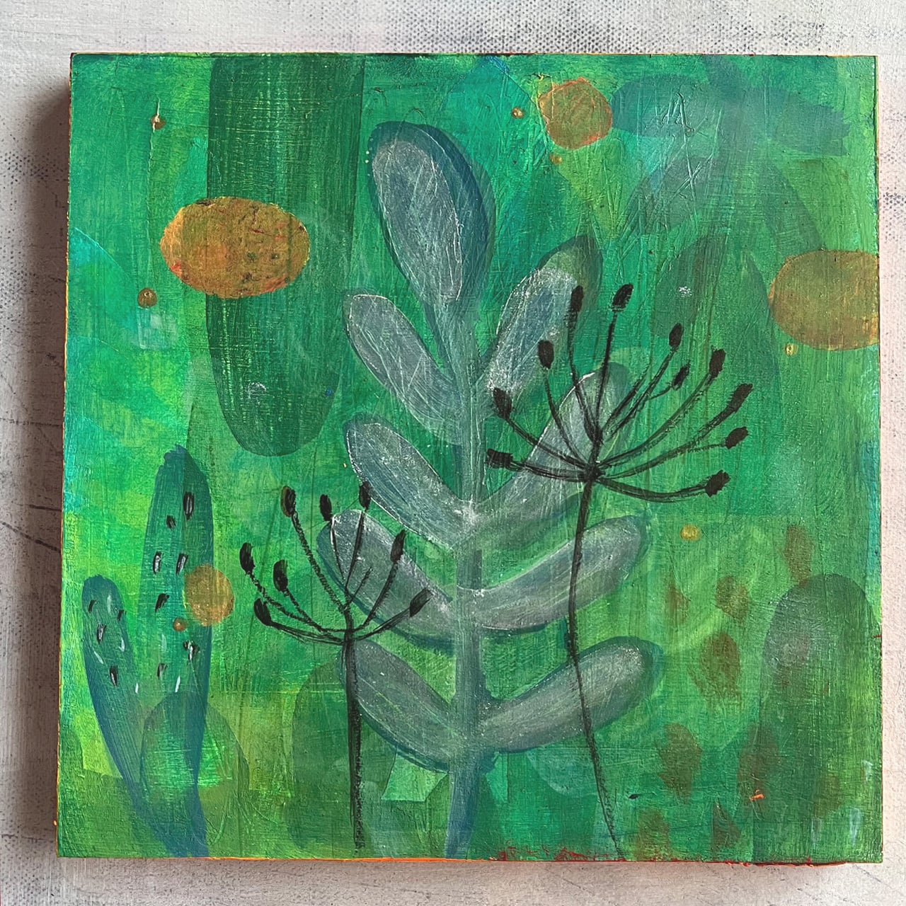 〈春の芽吹き〉 サイズ●195×195×10mm 素材・技法●ガッシュ/木製パネル 制作年●2024 エディション●1点物 額装●無し